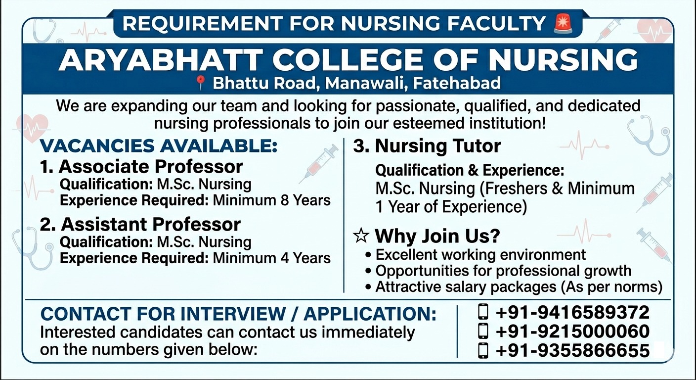 Aryabhatt College of Nursing was Nursing was established 2011 with sole aim of uplifting Urban/Rural women to make them idependent-socially, economically and emotionally. At the same time the institute also attempted to make them aware about the health concept of an individual which is a very important and delicate area of life.